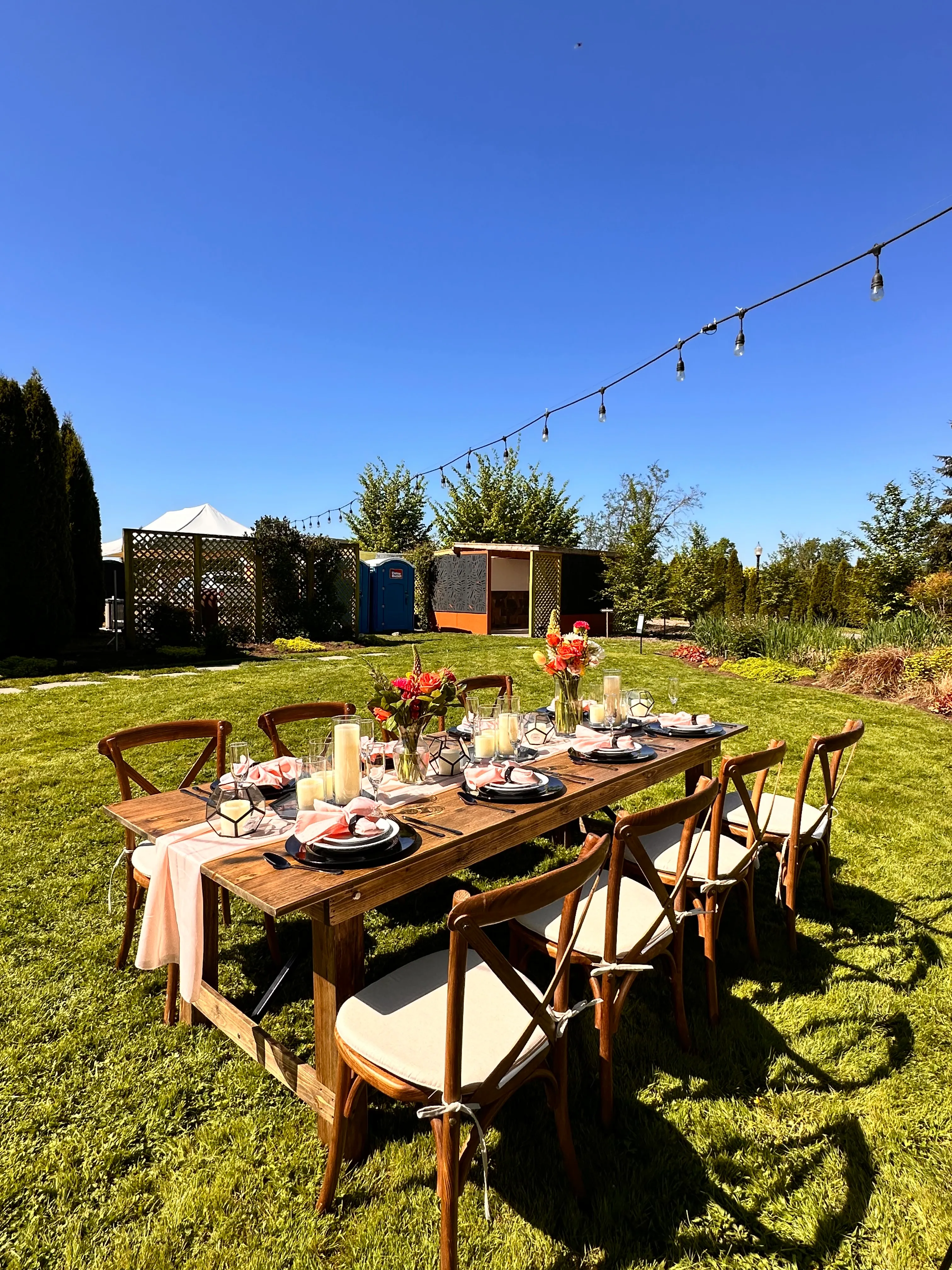 "Discover exquisite event rentals that transform your special occasion into an unforgettable experience. Explore our curated collection of elegant chairs, rustic farmhouse tables, and timeless decor, and let us help you create moments that last a lifetime."